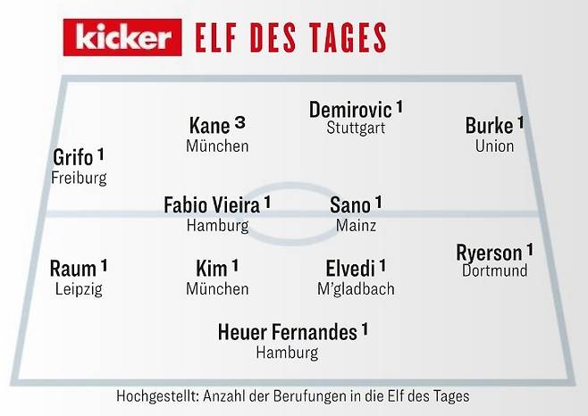 김민재는 21일(한국시간) 키커 선정 독일 분데스리가 4라운드 베스트11에 이름을 올렸다. 김민재를 포함해 해리 케인과 올리버 버크, 에르메딘 데미로비치, 빈첸초 그리포, 파비우 비에이라, 사노 가이슈, 니코 엘베디, 다비트 라움, 율리안 뤼에르손, 다니엘 호이어 페르난데스 등이 이름을 올렸다.