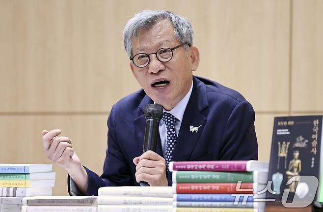 (서울=뉴스1) 구윤성 기자 = 유홍준 국립중앙박물관장이 23일 오전 서울 마포구 창비 서교빌딩에서 열린 '모두를 위한 한국미술사'와 '외국인을 위한 한국미술사' 출간 기념 기자간담회에서 신간을 소개하고 있다. 2025.9.23/뉴스1