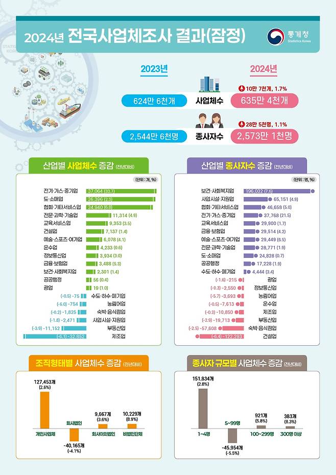 지난해 전체 사업체 종사자 수는 2573만 1105명으로 전년보다 28만 5208명(1.1%) 늘었다. 업종별 종사자는 제조업 414만 6119명(16.1%)으로 가장 많았고, 도·소매업 359만 9680명(14.0%), 보건·사회복지업 276만 4000명(10.7%) 등이 뒤를 이었다. 2023년 대비 보건·사회복지업(19만 6032명, 7.6%), 사업시설·지원업(6만 5151명, 4.9%) 등에서 늘었고, 건설업(-12만 2293명, -6.4%), 숙박·음식점업(-5만 7608명, -2.5%) 등은 감소했다.