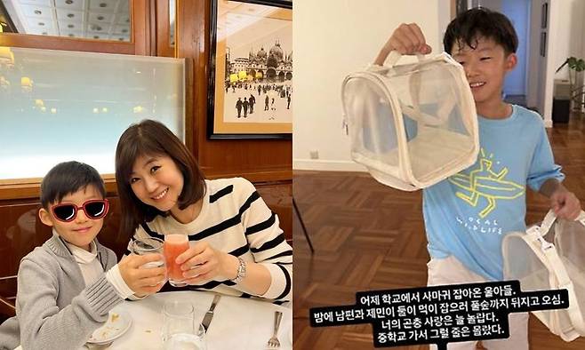 사진에는 환한 미소와 함께 사마귀가 든 곤충채집 통을 들고 엄마에게 자랑하는 강수정의 아들 모습이 담겨있다.