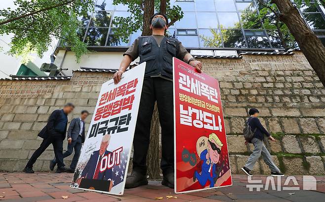 [서울=뉴시스] 김선웅 기자 = 전국민주노동조합총연맹(민주노총) 관계자들이 23일 서울 중구 정동 덕수궁 돌담길에서 선전전을 열고 미국 트럼프 행정부의 조지아 주 한국인 노동자 대규모 체포·구금, 인권침해 및 3500억 달러 규모 대미 직접투자 강요 등을 규탄하고 있다. 2025.09.23. mangusta@newsis.com