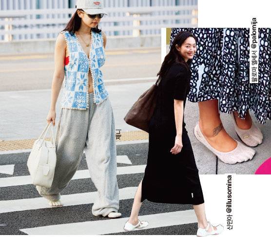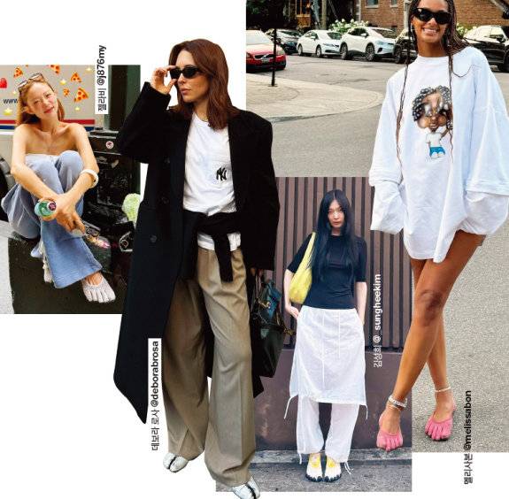 셀럽들도 발가락 신발 열풍에 합류했다. 해외에서는 모델 팔로마 엘세서, 패션 인플루언서 멜리사 본, 데보라 로사 등이 앞다퉈 발가락 신발 OOTD로 피드를 채웠다. 우아한 에르메스 백을 들고 비브람파이브핑거스를 신은 파격적인 믹스 매치 룩은 '못생긴 것일수록 힙하다’는 요즘 패션 지론을 몸소 입증하는 장면이다. 국내에서는 모델 김성희와 젤라비 등이 개성 넘치는 데일리 룩을 선보이며 발가락 신발이 일상에서도 충분히 활용될 수 있음을 보여줬다. 발가락 신발은 어떤 옷과 매치하느냐에 따라 단아한 무드부터 시크한 애슬레저 스타일까지 두루 소화해낸다. 헐렁한 슈트 팬츠에 신으면 스트리트 감성이 되살아나고, 반대로 스커트와 함께하면 걸리시한 매력을 살릴 수 있다.