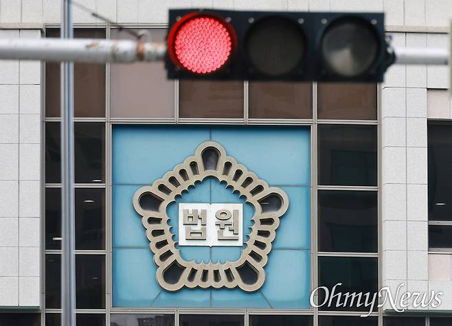 | ▲ 12.3 내란 재판 지연 논란이 이어지는 가운데, 김기영 내란청산사회대개혁부산행동 상황실장이 23일 낮 부산법원종합청사 앞을 찾아 조희대 대법원장과 지귀연 서울중앙지법 부장판사를 규탄하는 1인시위를 진행하고 있다. 법원 정문에 빨간 신호등이 켜진 모습. |
