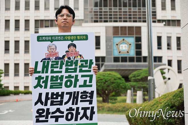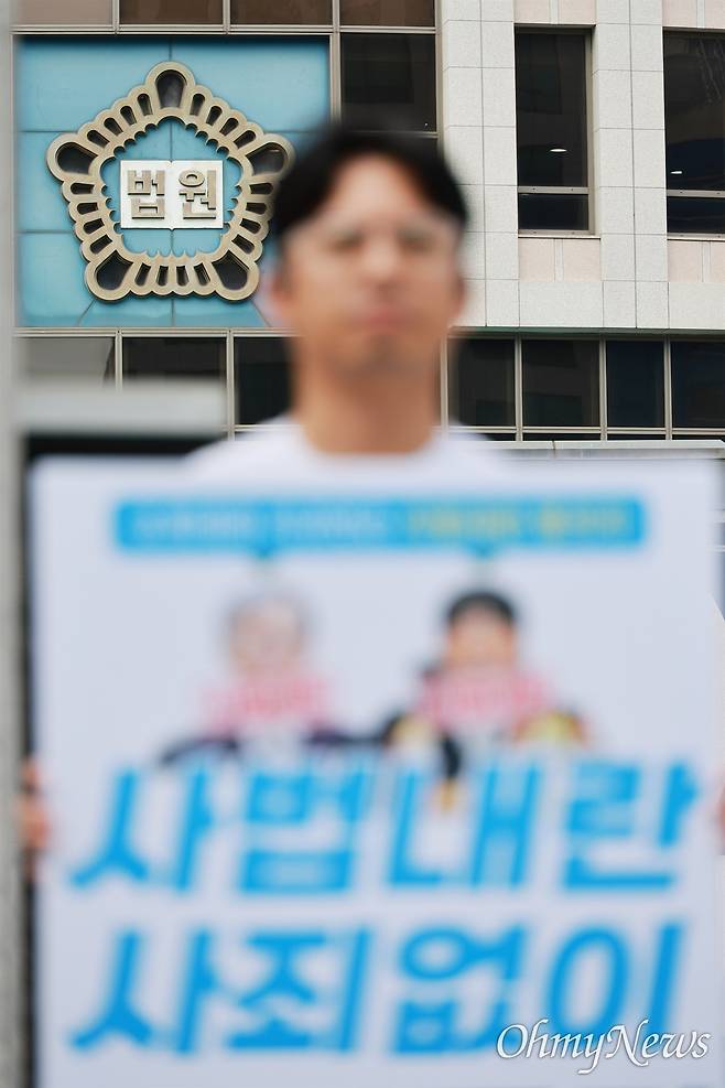 12.3 내란 재판 지연 논란이 이어지는 가운데, 김기영 내란청산사회대개혁부산행동 상황실장이 23일 낮 부산시 연제구 거제동 부산법원종합청사 정문에서 조희대 대법원장과 지귀연 서울중앙지법 부장판사를 규탄하는 1인시위를 진행하고 있다.