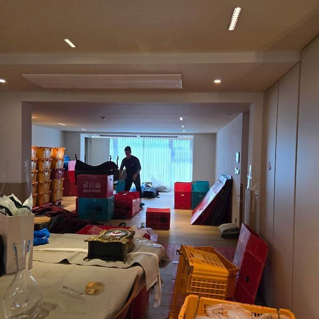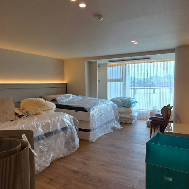 사진 속에는 아침부터 이사로 바쁜 황혜영의 일상이 담겨있다. 집안을 가득 채운 이삿짐들. 이 과정에서 안방에서 내려다보이는 한강뷰와 럭셔리한 가구들이 눈길을 집중시켰다.