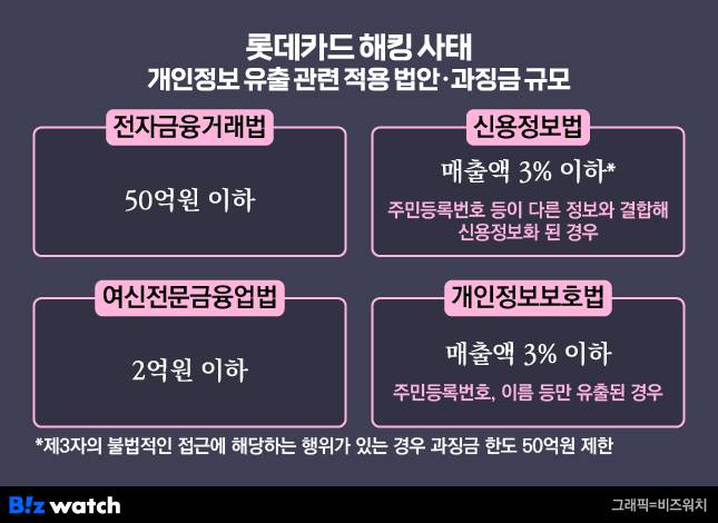 이번 롯데카드 해킹 사고처럼 대규모 정보 유출이 발생해도 과징금은 최대 50억원에 그칠 수 있다는 점이 문제로 지적되는 이유다.