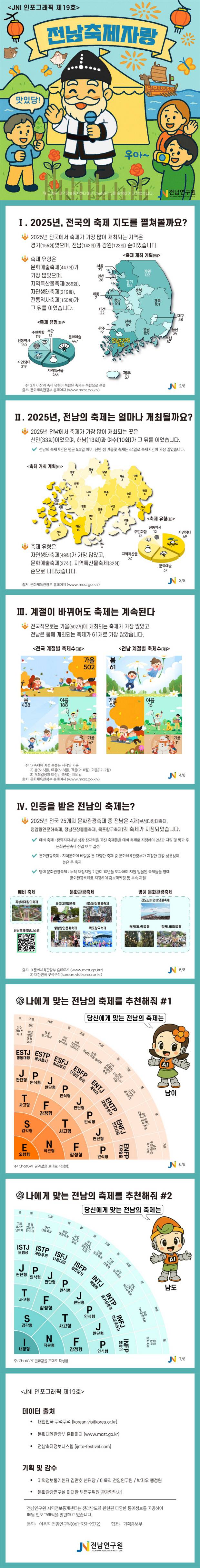 전남연구원이 23일 내놓은 '전남축제자랑'은 올 해 열린 전남도 축제(143건)에 대한 특성과 지역별 분포를 분석한 자료로, 자신에게 맞는 축제를 찾을 수 있는 'MBTI(성격 유형 검사)' 축제 추천 정보도 담았다.
