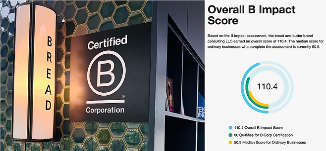 2018년부터 7년간 '비콥(Certified B Corporation)' 자격을 유지해 온 글로벌 브랜드 컨설팅사 더브레드앤버터(대표 조수영)가 최근 뉴욕의 미국 법인을 통해 110.4점의 높은 점수로 비콥 재인증을 획득했다.