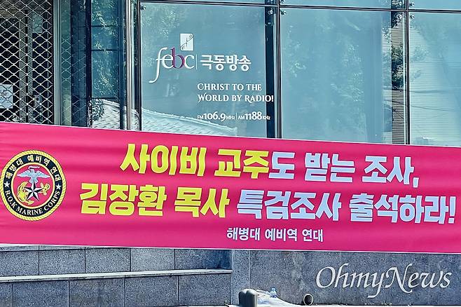 | ▲ 해병대예비역연대가 23일 오후 서울 마포구 극동방송 앞에 내건 현수막. 김장환 목사(극동방송 이사장)의 채해병 특검팀 출석을 요구하는 내용이 적혀 있다. |