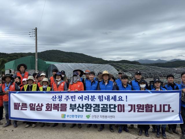 부산환경공단(이사장 이근희)은 지난 12일 집중호우로 큰 피해를 입은 경남 산청군 신안면 수대마을 농가를 찾아 수해 복구 봉사활동을 실시했다고 밝혔다.