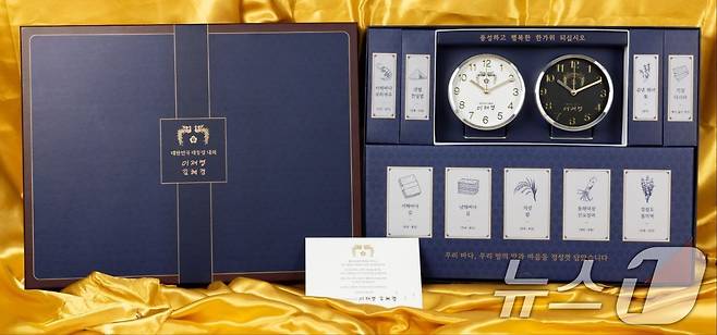 (서울=뉴스1) 허경 기자 = 이재명 대통령이 취임 후 첫 추석을 맞아 국민 통합과 민생 회복을 기원하며 각계각층에 추석 선물을 전달한다. 대통령실은 23일 보도자료를 통해 "선물 대상에는 국가 발전과 국민 생활의 안정을 위해 함께 노력해 온 각계 주요 인사, 국가를 위해 헌신한 호국 영웅, 그리고 어려운 환경 속에서도 희망을 지켜온 재난·재해 피해 유족 및 사회적 배려 계층이 포함됐다"며 "특히 올해는 우리 사회의 노동 현장에서 땀흘려 일하다 안타깝게 생을 마친 산업재해 희생자 유가족분들에게도 선물이 전달될 예정"이라고 밝혔다. 올해 추석 선물은 대통령 시계, 8도 수산물, 우리 쌀로 구성되었다. (대통령실 제공. 재판매 및 DB 금지) 2025.9.23/뉴스1