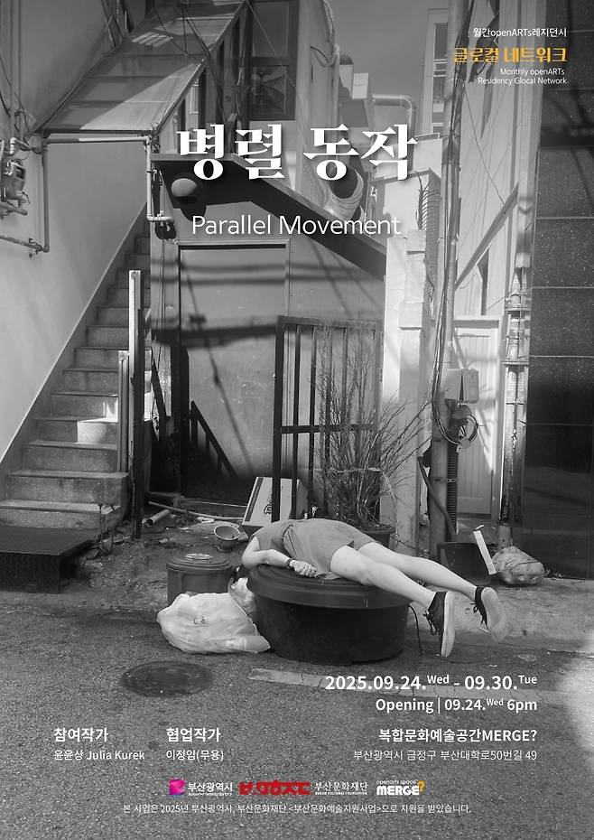 부산의 복합문화예술공간 'MERGE(머지)?'에서 국내외 예술가들의 협업으로 탄생한 '병렬 동작 - Parallel Movement' 전시가 오는24일부터 30일까지 열린다. 이번 전시는 한국 작가 윤윤상, 폴란드 작가 줄리아 쿠렉(Julia Kurek), 부산 지역 협업 작가로 이정임 무용수가 참여해 도시와 인간의 동시대 변화를 예술적으로 탐구하는 독특한 시도로 기대를 모은다