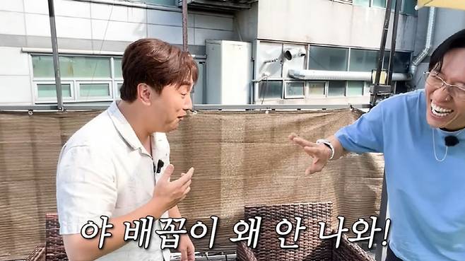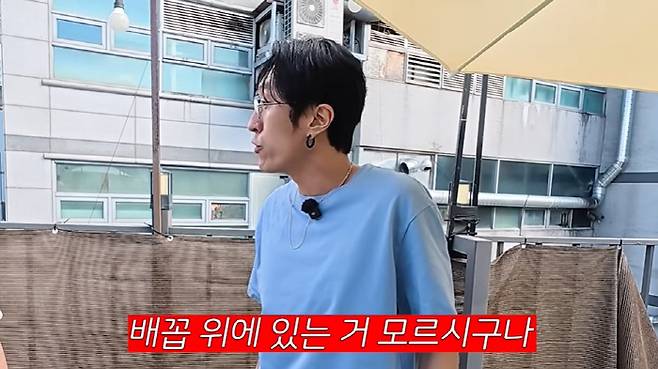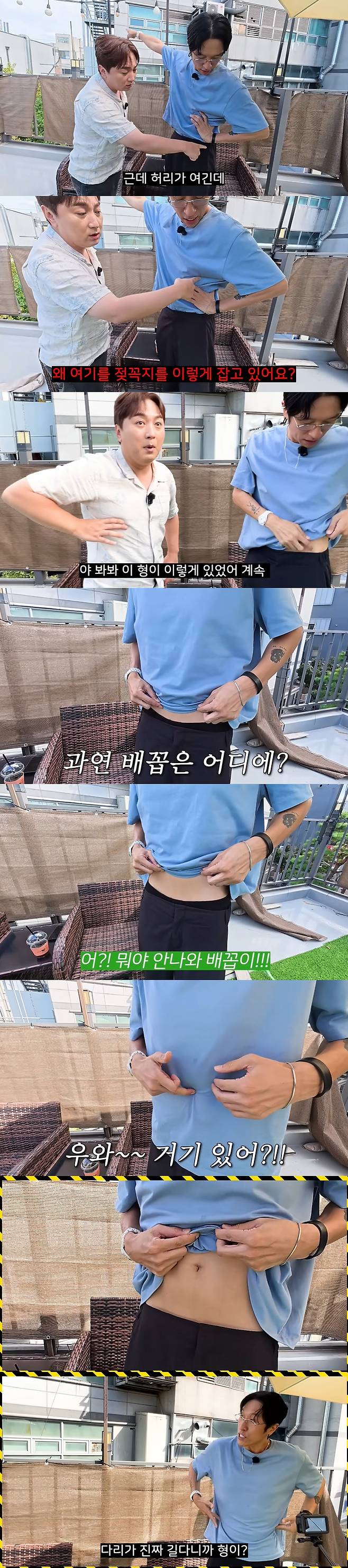 빽가는 "되게 재미있는 신체의 비밀을 알려주겠다"며 자신의 상의를 들어 올렸고, 한참이 지나서야 배꼽이 드러났다.