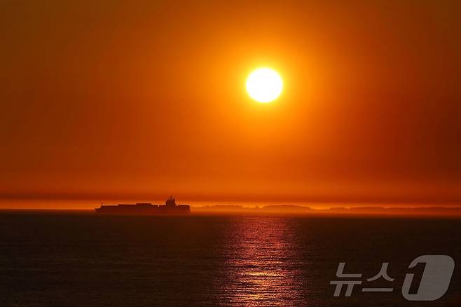 (퍼스 AFP=뉴스1) 권영미 기자 = 22일 호주 퍼스에서 해가 지는 가운데 프리맨틀 항구에 정박한 한 컨테이너선이 보인다. 2025.09.22.