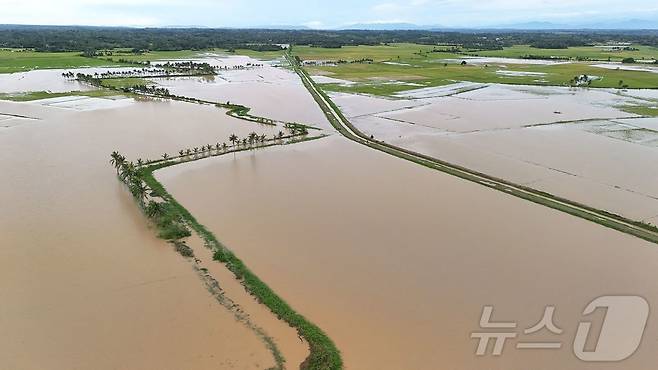 (칼라마니우간 AFP=뉴스1) 권영미 기자 = 23일 필리핀 마닐라 북쪽 카가얀 주 칼라마니우간 마을의 침수된 논이 항공 사진으로 포착됐다. 초강력 태풍 라가사가 해당 지역에 상륙한 다음 날의 모습이다. 라가사는 나무를 쓰러뜨리고 건물 지붕을 날려버렸으며, 산사태를 일으켰다.2025.09.23.
