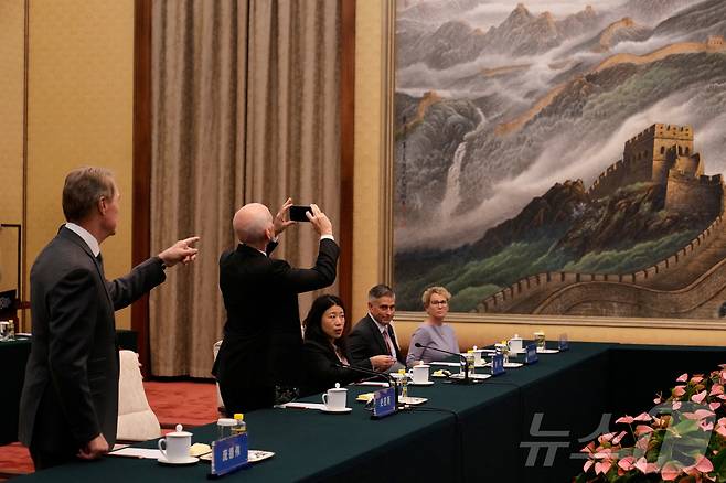 (베이징 로이터=뉴스1) 김지완 기자 = 22일 중국 베이징을 방문중인 미국 의회 대표단 구성원인 애덤 스미스 하원의원(민주·워싱턴주)이 허리펑 국무원 부총리와의 회담 전 인민대회당 회담장에 걸린 만리장성 그림을 사진으로 찍고 있다. 2025.09.22