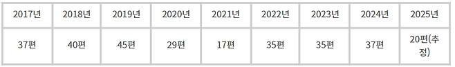 2025년 한 해를 통틀어 극장에서 신규 개봉하는 한국 상업 영화가 ‘20편’에 불과할 전망이다. 이는 코로나19 팬데믹 이전인 2017년~2019년 3개년 평균 상업 영화 개봉 편수인 40.6편 대비 절반 수준이다. 관객 감소 등 수익성 악화로 한국 영화계의 제작 동력이 현저히 떨어졌음을 보여주는 수치다.