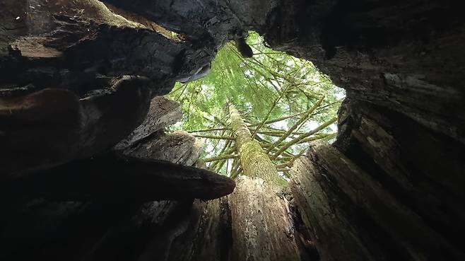 | ▲ 벌목된 나무의 그루터기 19세기 후반부터 벌목되고 남은 거대한 그루터기 위로 2세대, 3세대의 나무들이 자라고 있다. |