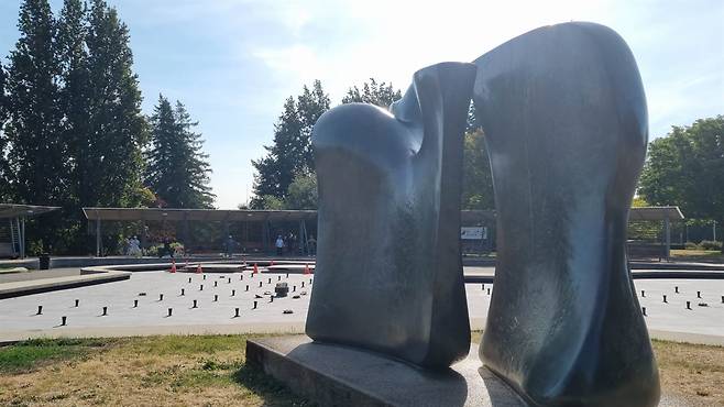 | ▲ 퀸 엘리자베스 공원의 Henry Moore 조각, 나이프 에지 투 피스 옆 분수 밴쿠버에서 가장 높은 지점의 랜드마크로 역할을 했던 '댄싱 워터스(Dancing Waters)' 분수는 운영이 중단되어 있었다. |