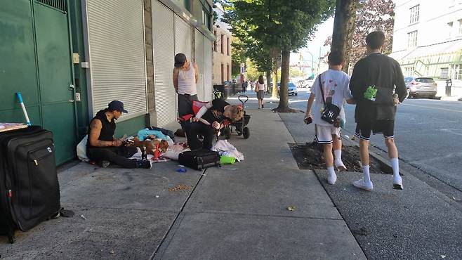 | ▲ 이스트 헤스팅스 스트리트(East Hastings Street). 밴쿠버 내에서 마약 문제와 사회적 어려움이 가장 심각한 지역이다. |