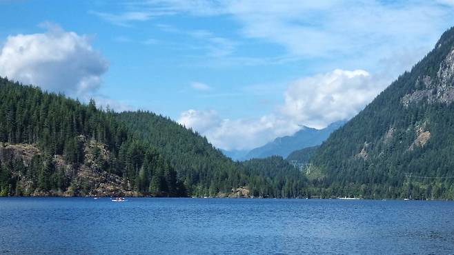 | ▲ 번츤 호수 이 호수는 산 넘어 코퀴틀람 호수의 물을 발전용으로 공급받는다. |