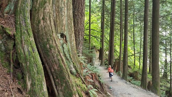 "마치 긴 창처럼 하늘로 뻗은 나무들은 세 가지가 주종을 이룹니다. 웨스턴 레드 시더(Western Red Cedar)는 나뭇결이 곧고 잎이 비늘 모양이고, 웨스턴 헴록(Western Hemlock)은 껍질이 얇고 매끄러운 회색이고 잎은 평평하고 바늘 모양입니다. 더글러스 퍼(Douglas Fir)는 두껍고 갈라진 모양의 거친 껍질이며 잎 또한 뾰족합니다."