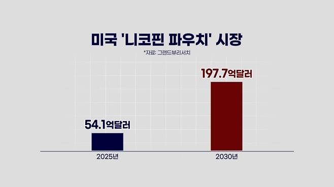 시장조사업체 그랜드뷰리서치는 현재 54억달러 수준인 미국 니코틴 파우치 시장이 2030년 197억달러 규모로 커질 것으로 예상합니다.