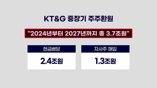 앞서 KT&G는 2027년까지 현금배당, 자사주 매입 등 총 3조7,000억원 규모 주주환원을 추진하기로 했습니다.