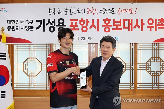 (포항=연합뉴스) 프로축구 K리그1 포항스틸러스 소속 기성용 선수(왼쪽)가 23일 경북 포항시청에서 포항시 홍보대사로 위촉된 뒤 이강덕 포항시장과 악수하고 있다. 2025.9.23 [포항시 제공. 재판매 및 DB 금지]