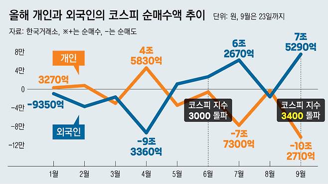 코스피 지수가 역사상 첫 3500선 돌파를 목전에 두고 외국인 투자자와 ‘개미(개인)’ 투자자가 정반대 행보를 보이고 있다. 외국인은 이달 들어 삼성전자 등 반도체주를 대거 사들이며 ‘달리는 말’에 올라타고 있다면, 개미들은 역대 최대 순매도를 보이며 ‘달리는 말’에서 뛰어 내려오고 있다. 삼성전자와 ‘코스피’에 매번 실망했던 기억이 누적된 탓이다. 그러나 외국인이 국내 주식을 계속 사들이고, 지수 상승세도 지속될 경우 개미들의 시선이 바뀔 수 있다는 관측도 나온다.