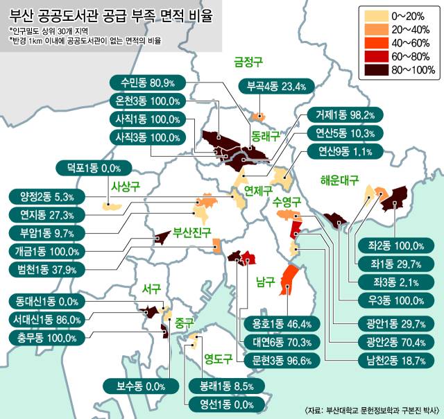 부산에서 인구 밀도가 가장 높은 지역인 해운대구 우3동(3만 3021명/㎢), 부산진구 개금1동(3만 2201명/㎢), 동래구 사직1동(2만 8446명/㎢)은 반경 1km에 공공도서관이 없다. 전체 동 면적 가운데 공공도서관 반경 1km 이내에 해당하는 비율이 ‘0’이라는 뜻이다. 이곳 주민 5만 8000여 명은 공공도서관 접근성이 크게 떨어지는 곳에 살고 있는 셈이다.