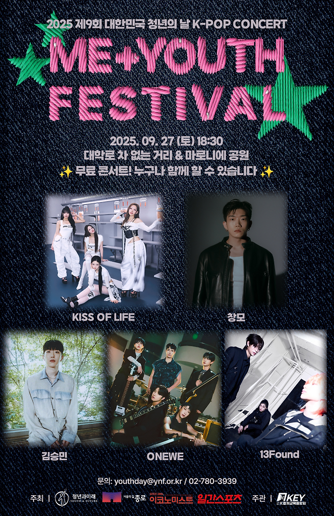 청년과미래(이사장 정현곤)가 주최하는 ‘2025 제9회 대한민국 청년의 날’ 특별기획 미유페(Me+Youth Festival) 콘서트가 오는 27일 대학로 차 없는 거리에서 개최된다. 콘서트 라인업은 키스오브라이프(KISS OF LIFE), 창모, 원위(ONEWE), 김승민, 13파운드(13Found)로 최종 확정됐다.