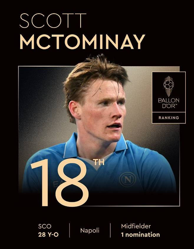 그리고 뎀벨레의 수상 전까지 발롱도르 순위에 이름을 올린 이들이 한 명씩 호명됐다. 그중 눈에 띄는 이름 중 하나는 바로 스콧 맥토미니였다. 그는 이번 발롱도르 18위를 차지하며 가치를 인정받았다.