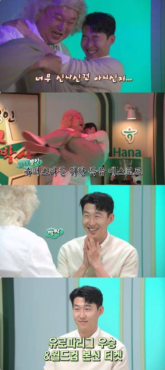 손흥민의 등장에 강호동은 흥분한 모습이었다. 강호동은 단번에 손흥민을 안아 올리더니 환호했고, 직접 의자에 앉혀주기도 했다. 손흥민은 강호동만의 격한 환영 방식에 다소 당황한 듯 했지만 환하게 웃었다.