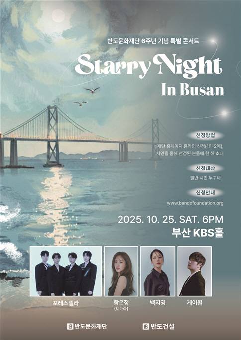반도문화재단은 반도건설이 2019년 문화예술의 대중화와 사회적 공헌을 위해 설립한 비영리 공익법인으로 올해로 설립 6주년을 맞았다. 재단 설립 이후 소외계층을 포함한 일반 시민의 문화 활동 확대와 열악한 예술계 활동 지원을 지속했으며 ‘사랑의 집수리’ 활동을 통해 취약계층의 주거 및 근무 환경 개선에도 힘쓰는 등 기업의 사회적 역할에 앞장서 왔다. 설립 6주년을 맞아 마련된 이번 콘서트 ‘Starry Night In Busan’은 반도건설의 태동이 시작된 항도 부산에서 뜻깊은 의미를 담아 더 많은 이들과 문화 공연의 기회를 나누기 위해 기획됐다. 해당 콘서트에는 배우 겸 가수 티아라 함은정이 MC를 볼 예정이며, 발라드의 황제 케이윌, 발라드의 여왕 백지영, 크로스오버 그룹 포레스텔라가 무대에 설 예정이다.