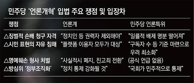 더불어민주당이 언론중재법·정보통신망법(망법) 개정안의 ‘추석 전 입법’ 방침을 철회했다. 언론현업단체의 ‘숙의’ 요청이 일부 반영되고 최근 ‘11월 처리’가 거론되지만 그간 우려의 본질은 아직 남아있다. 언론계의 핵심 요구사항인 ‘정치인의 징벌적 손해배상 청구자격 제한’은 여전히 수용되지 않았다. 망법을 통한 징벌적 손배제가 국민 전반 표현의 자유 침해 우려를 낳고, 방송통신심의위원회 ‘정부기구화’에 ‘정치통제 강화’ 지적도 이어지고 있다.