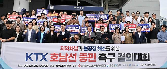 광주시는 23일 광주송정역 광장에서 시의회, 5개 자치구, 광산구의회, 시민 등과 함께 ‘KTX 호남선 차별·불공정 해소 촉구 결의대회’를 열고 KTX 운행 개선안을 정부에 건의했다. 이날 결의대회에는 강기정 시장을 비롯해 서용규 광주시의회 부의장과 시의원들, 박병규 광산구청장, 김명수 광산구의회 의장 등 30여명이 참석했다.