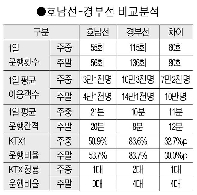 현재 평일 기준 1일 KTX 운행 횟수는 경부선 115회, 호남선 55회로 2배 이상 차이가 난다.