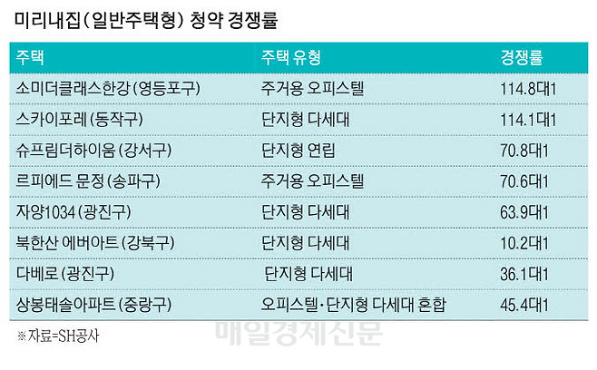 이번에 처음 모집하는 비아파트형 미리내집은 총 8곳 164가구였다. 주택별 경쟁률을 보면 주거용 오피스텔인 소미더클래스한강이 114.8대1로 가장 높았다. 이어 단지형 다세대주택인 스카이포레가 114.1대1을 기록했고, 단지형 연립주택인 슈프림더하이움은 70.8대1의 높은 경쟁률을 보였다.