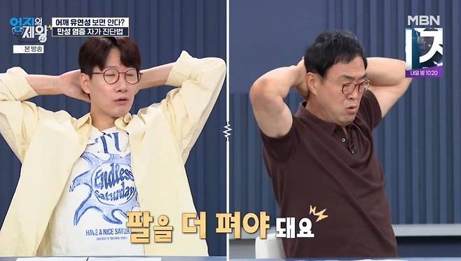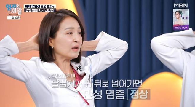 이에 정세연은 염증 자가진단방법을 공개했다. 그는 "양손깍지를 끼고 뒤통수를 감싼다. 가능한 만큼 팔꿈지를 등 뒤로 보낸다. 옆에서 내 모습을 봤을 때 팔꿈지가 귀 뒤로 넘어가 있으면 정상, 귀를 가린다면 염증이 있을 수 있다"고 전했다.