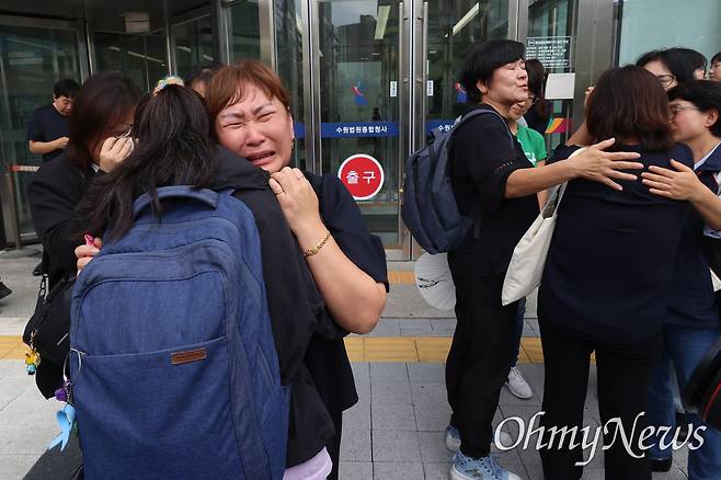 | ▲ 아리셀 산재피해가족협의회와 아리셀 중대재해참사대책위원회 관계자들이 23일 오후 수원지방법원 앞에서 화성 아리셀 리튬배터리 공장 화재 참사와 관련해 박순관 대표의 1심 선고 직후 기자회견을 열고 "징역 15년 형량은 너무 적다"며 눈물을 흘리고 있다. |