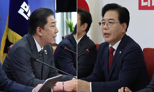 | 대치 정국 더불어민주당이 25일 이재명정부 정부조직법 개정안 통과를 추진하는 가운데, 국민의힘이 법안 저지를 위한 필리버스터(무제한토론)를 예고하면서 정국이 급랭하고 있다. 민주당 김병기 원내대표(왼쪽 사진 가운데)가 23일 원내대책회의에서, 국민의힘 송언석 원내대표(오른쪽 사진 가운데)는 같은날 취임 100일 기념 기자간담회에서 발언하고 있다. 허정호 선임기자 |