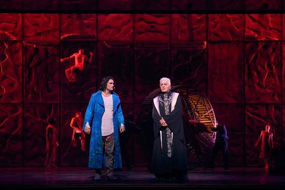 이 작품은 52개의 노래로만 이야기를 전개하는 ‘성스루(sung-through)’ 형식이다. 풍부한 성량을 지닌 배우들의 애절하면서도 생동감 넘치는 목소리가 무대를 가득 채운다. 특히 주교 프롤로 역의 다니엘 리부아는 76세의 고령이 믿기지 않는 폭발적인 가창력으로 극의 중심을 잡는다. 노래 못지않게 매력적인 것은 여느 뮤지컬에서 쉽게 보기 어려운 고난도 안무다. 댄서들은 건물 4층 높이의 성당 벽을 오르내리고, 공중에 매달린 대형 종을 흔들며 무대를 휘젓는다. ‘미치광이들의 축제’ 넘버에서 시대의 광기를 표현하는 군무는 이 작품의 하이라이트다.