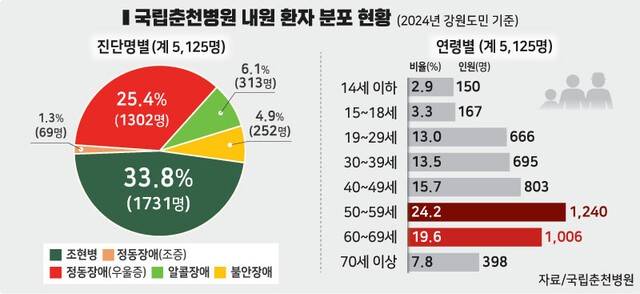 정신건강 문제로 병원을 찾은 강원도민이 가장 많이 진단받은 질환은 조현병과 우울증으로 나타났다. 지난해 기준 국립춘천병원 외래 진단명별 분포를 살펴보면 전체 5125명 중 조현병을 진단받은 이는 1731명으로 집계됐다. 전체의 33.8%로 가장 높은 비율을 차지했다. 정동(기분)장애, 그중에서도 우울증을 진단받은 이들이 1302명(25.4%)으로 두 번째로 많았다. 발달장애(정신지체)가 499명(9.7%), 알코올장애가 313명(6.1%), 불안장애가 252명(4.9%), 적응장애가 177명(3.5%)으로 뒤를 이었다.