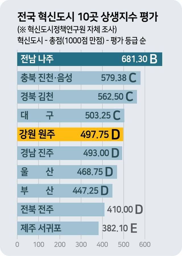 성장·활력·협력 3개 분야에서 공공기관 및 지자체의 지역 기여도를 정량 평가해 1000점 만점으로 점수를 매긴 결과 S·A등급은 1곳도 없었다. 전남 나주만 681.3점으로 B등급을 받았고, 다른 곳은 모두 C등급 이하로 나타났다. 원주는 D등급이었다.