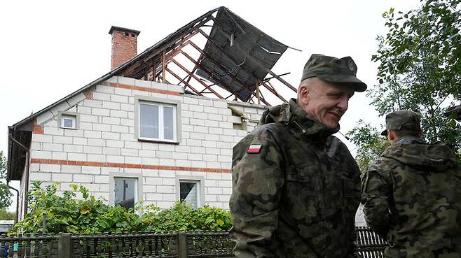 ▲ 현지시간으로 지난 11일 우크라이나 공격 중 러시아 드론이 폴란드 영공을 침범한 후, 지역 방위군 장교들이 파손된 주택 근처에 서 있다.