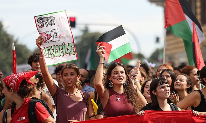 | 로마선 팔 지지 시위… “이, 학살 멈춰라” 22일(현지시간) 이탈리아 로마에서 벌어진 팔레스타인 지지 시위에 참여한 시민들이 ‘대량학살을 멈춰라’고 적힌 선전물과 팔레스타인 깃발 등을 흔들고 있다. 이날 로마, 피렌체 등 전국 각지에서는 팔레스타인 국가 선언을 지지하고 이스라엘로의 무기 수송 중단을 촉구하는 파업과 시위가 벌어졌다. 일부 시위대는 경찰과 충돌하기도 했다. 이탈리아는 팔레스타인을 국가로 인정하지 않고 있다. 로마=신화연합뉴스 |