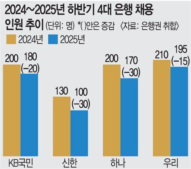 KB국민·신한·하나·우리 4대 은행이 올해 하반기 채용 인원을 전년 동기보다 100명가량 줄였다. 은행권에서 모바일 뱅킹 확산과 생성형 인공지능(AI) 도입 등을 이유로 점포를 빠른 속도로 줄여나가는 흐름과 무관치 않다. 금융 당국은 은행권의 무분별한 점포 폐쇄를 막아야 한다는 문제의식은 갖고 있지만 관련 가이드라인은 수개월째 손대지 못하고 있다.