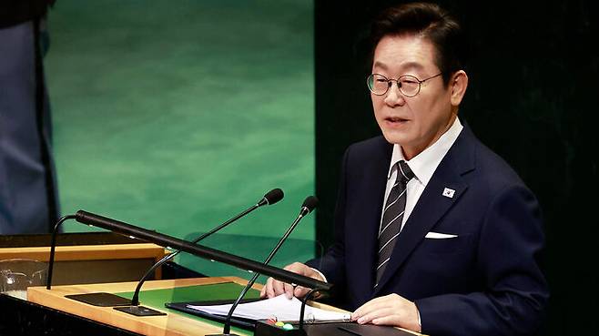 ▲ 이재명 대통령이 23일(현지시간) 미국 뉴욕 유엔본부 총회장에서 기조연설을 하고 있다.