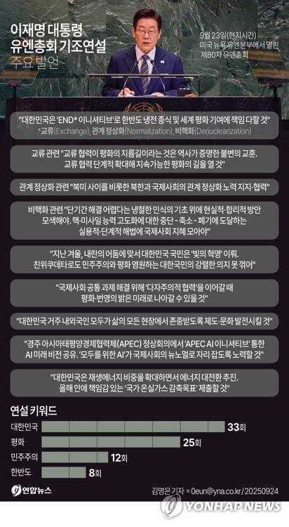 (뉴욕=연합뉴스) 임형섭 고동욱 기자 = 이재명 대통령은 23일(현지시간) 유엔총회 기조연설에서 한반도의 냉전을 종식할 방법론으로 이른바 '엔드(END) 이니셔티브'를 제시했다.